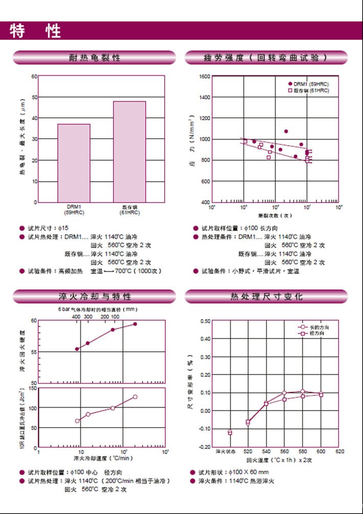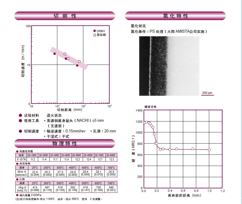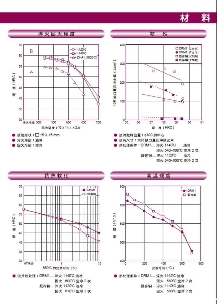 日本大同DRM1高速钢:高硬度高韧性钢,主要用于热作锻造。
